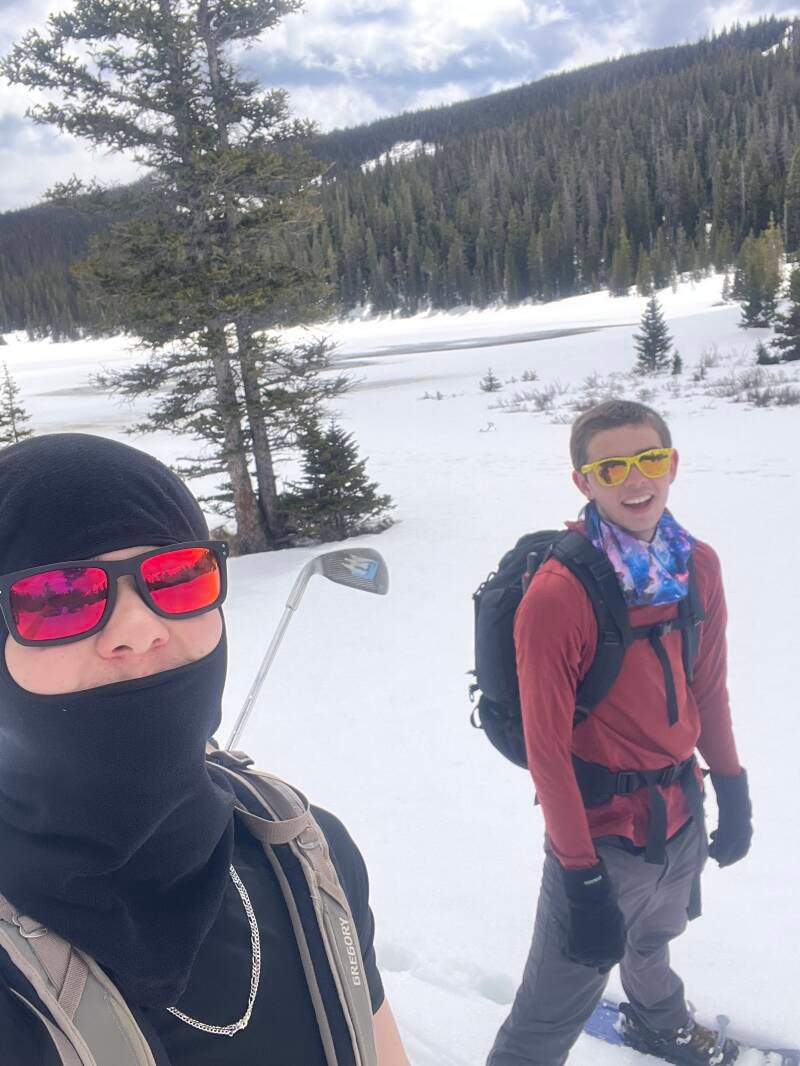 We walked fairly slowly to a lake called Isabel Lake, and we took out a golf club and three colored balls to try our best swings on the frozen lake. (We lost a ball, and all the shots were quite disappointing, but it was a fun experience.)